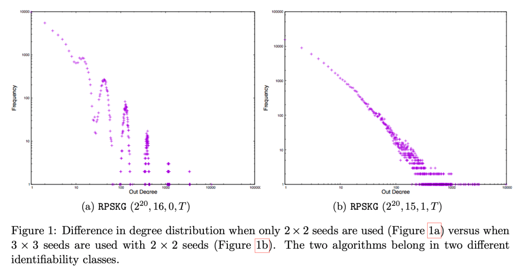 It is well-known that many real-world networks have degree distributions that follow a lognormal or power-law distribution. However, stochastic Kronecker graph models cannot always generate graphs with degree distributions that follow lognormal or power-law. The degree distributions seem to have significant oscillations. In a recent work, my friend/collaborator and I (paper forthcoming) analyze techniques that could get rid of oscillations in the degree distribution of generated graphs—see Figure 1 below. We believe our work could lead to a better understanding and classification of graph generation algorithms.